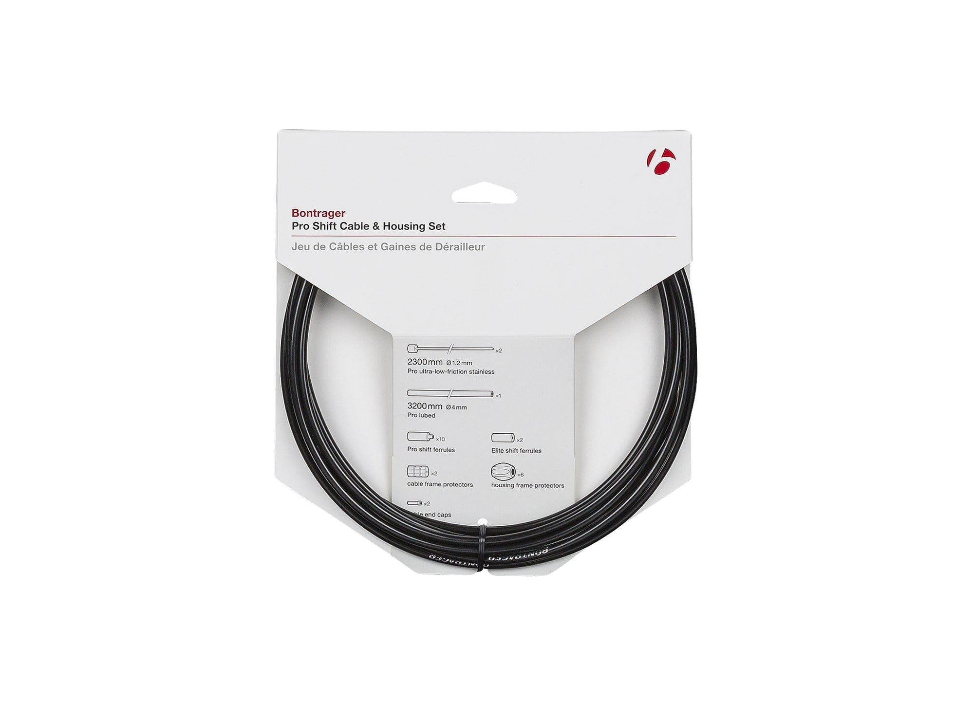 This premium kit is for the performance rider looking for incredibly smooth shifting;Compatible with Shimano ® and SRAM ® drivetrains;Ultra-low-friction cables are both 2300 mm long, for front and rear shifting;Black compressionless housing includes low-friction Pro lube and is 3200 mm long;Kit includes low-friction Pro shift ferrules, frame protectors, and cable end caps;Included stainless steel cables are rust-proof and come pre-stretched;