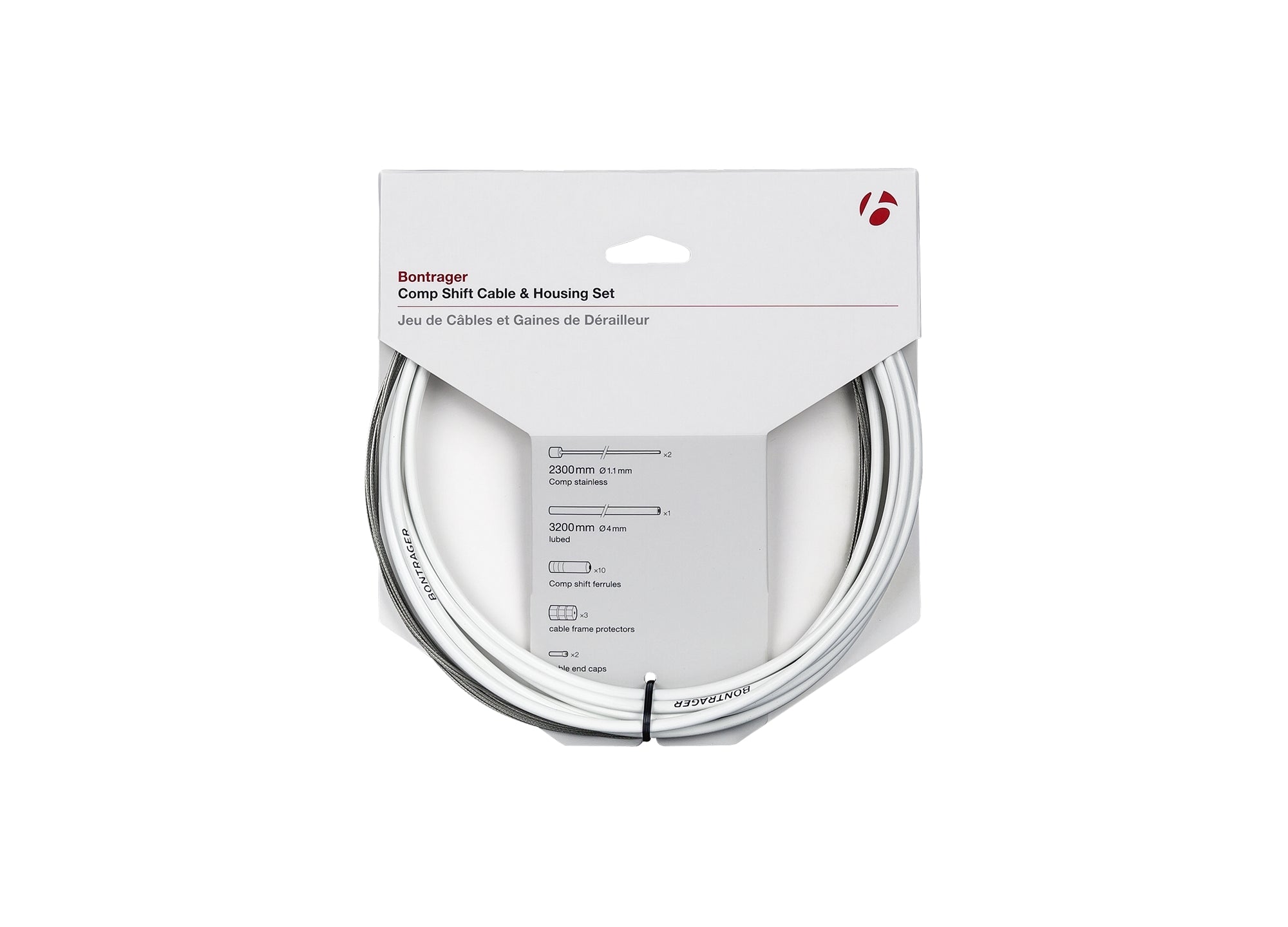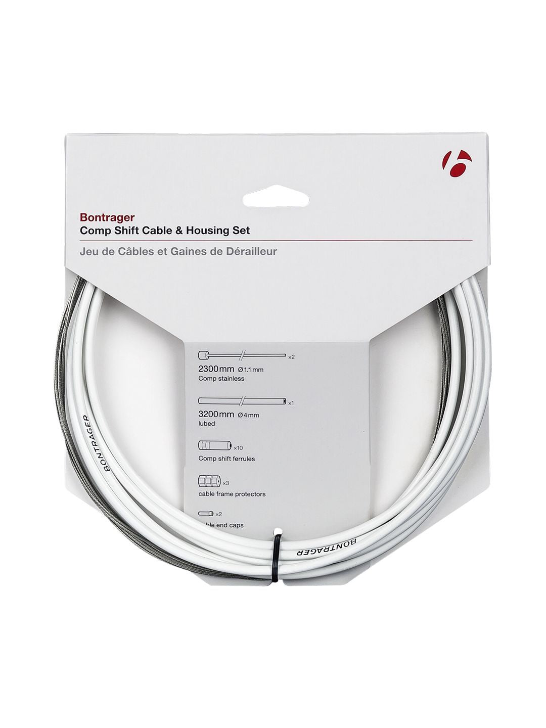 This convenient and valuable kit is the key to restoring your shifting performance;Compatible with Shimano ® and SRAM ® drivetrains;Stainless steel cables are 2300 mm and 1700 mm long, for front and rear shifting;Compressionless housing comes pre-lubed is 3200mm long;Kit includes Comp shift ferrules, cable frame protectors, and cable end caps;Included stainless steel cables are rust-proof and come pre-stretched;