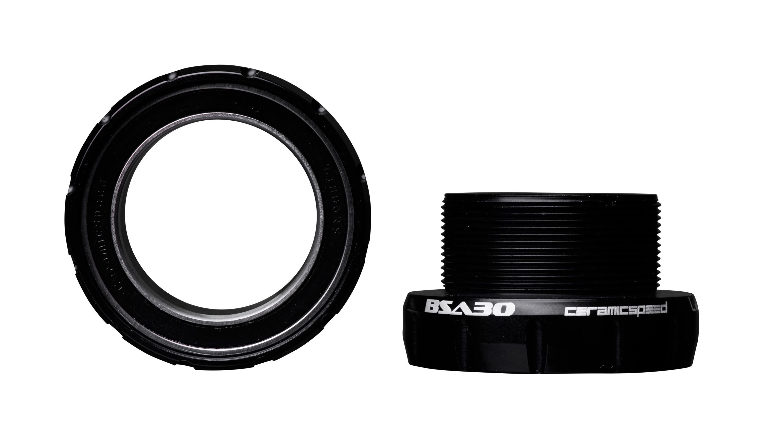 BSA comes from British Standard Cycle, aka English threading. English threading on road bikes mean a 68mm wide, 34mm inside diameter shell with reverse threading on the drive side. Its the most common threaded standard employed today. This kit allows you to fit 30mm thru-axle cranks, like those from Rotor, to fit in the tight space of this 34mm spindle.