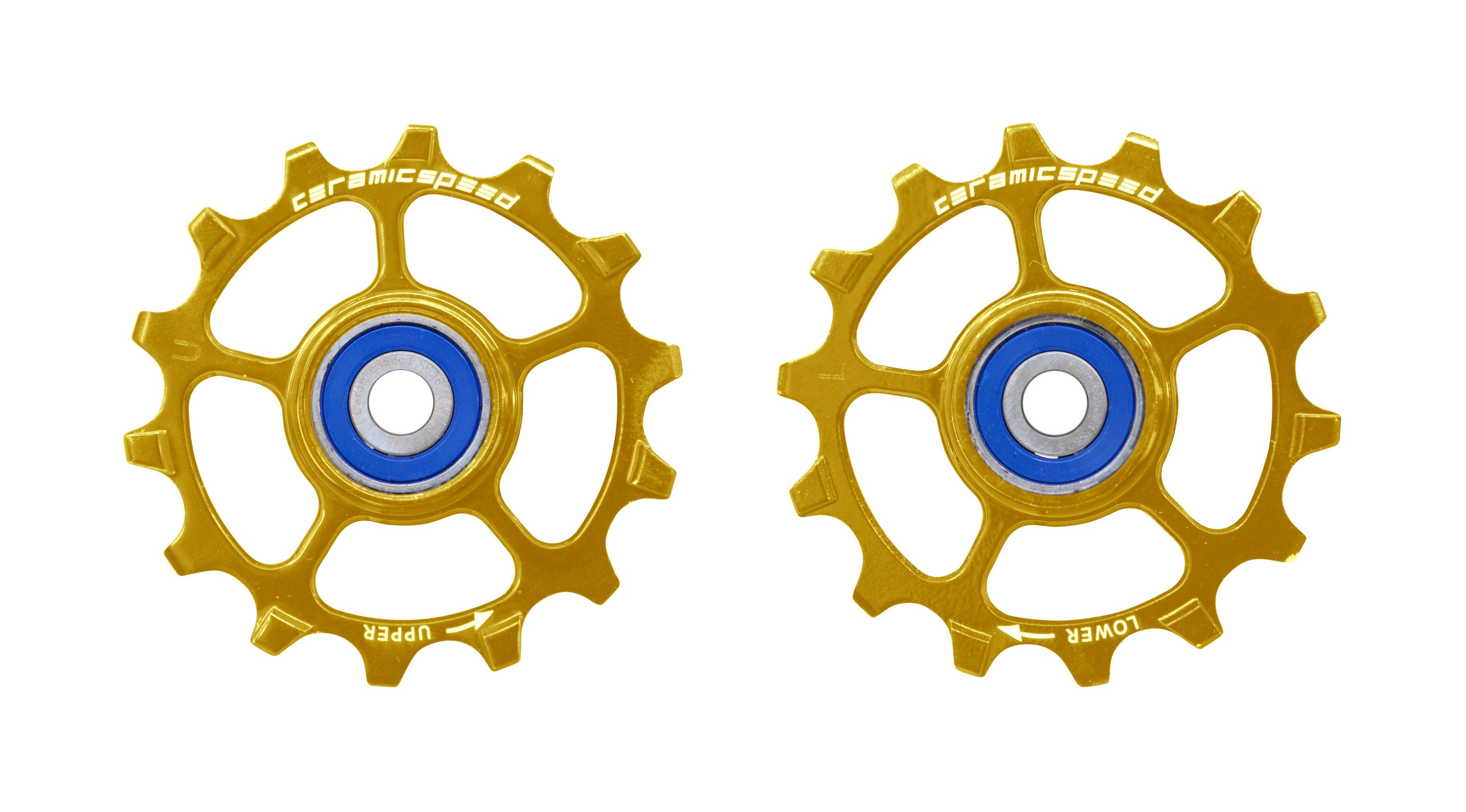 When you go with these, you need to choose between four options. Machined aluminum pulleys with our CeramicSpeed Balls in stainless steel-races. These win efficiency tests everywhere, dominating the manufacturers pulleys. The second has aluminum pulleys with our CeramicSpeed Balls in Coated races. Third is machined titanium pulleys with our Standard Bearings. Fourth is machined titanium pulleys with our standard CeramicSpeed Balls installed in coated, hardened-steel races.