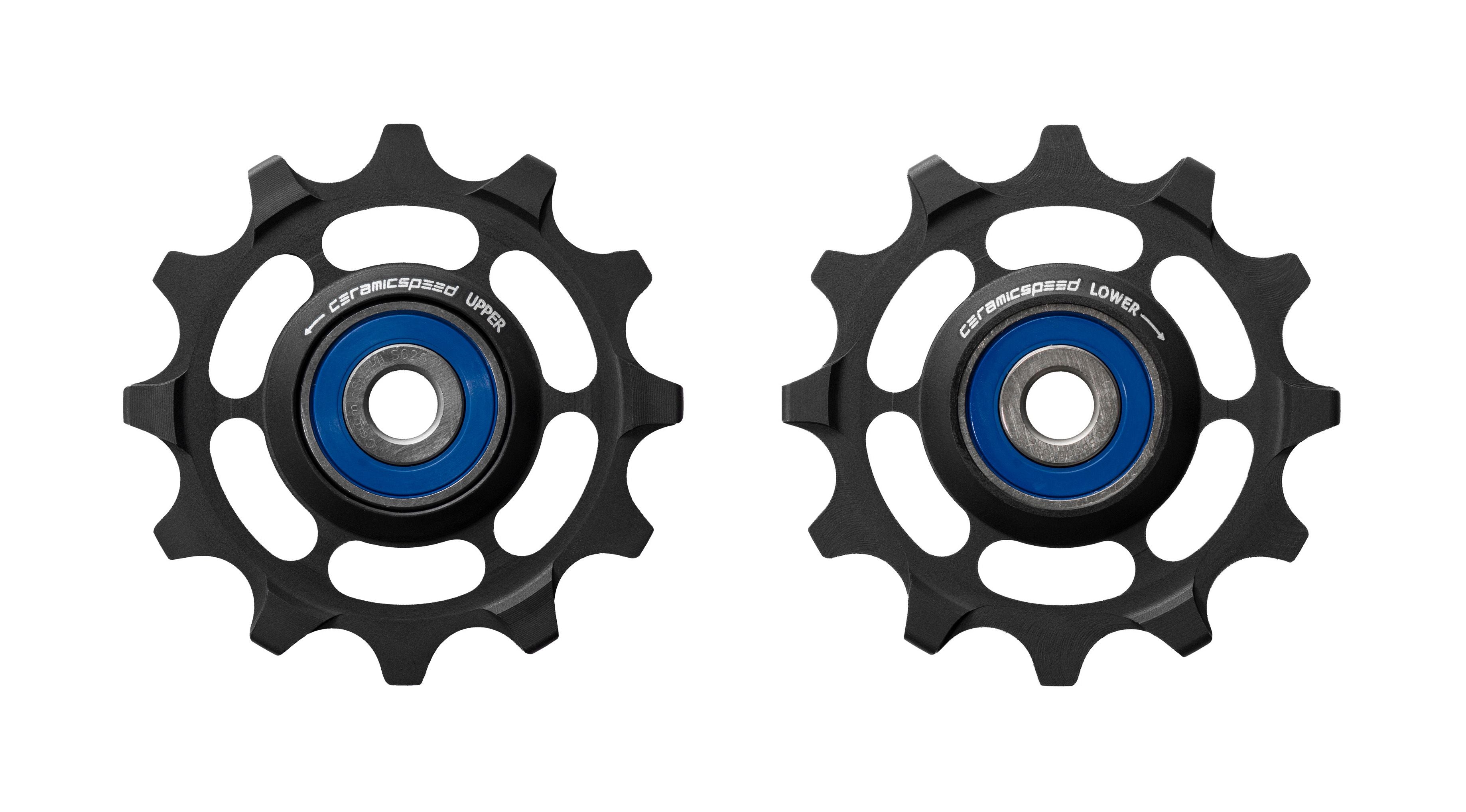 There are choices, so you can choose for your needs. Machined aluminum pulleys with our CeramicSpeed balls in hardened-steel races is the base. The bearings are our Standard Bearings. These test better than anything else on the market. The second option is machined titanium pulleys with our Stock Bearings. The third is machined titanium pulleys with our CeramicSpeed balls installed in Coated, hardened-steel races.