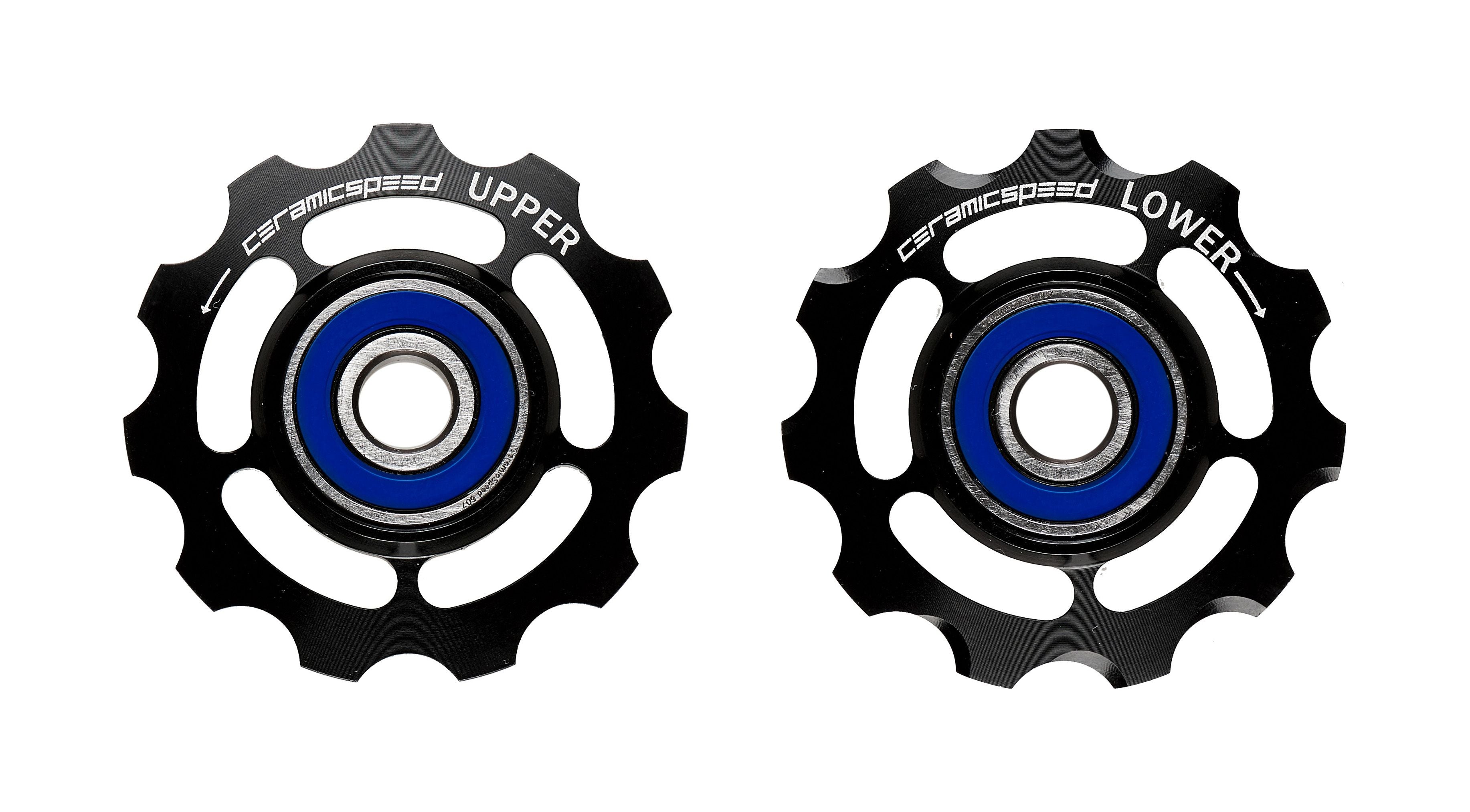 There are three choices for SRAM. The first is our Standard: machined aluminum pulleys with our stock CeramicSpeed balls installed in our hardened-steel races. These kill the competition in tests. The second is taking those Standard Bearings and installing them in machined titanium pulleys. The third is those same machined titanium pulleys with our CeramicSpeed balls installed in Coated, hardened-steel races.