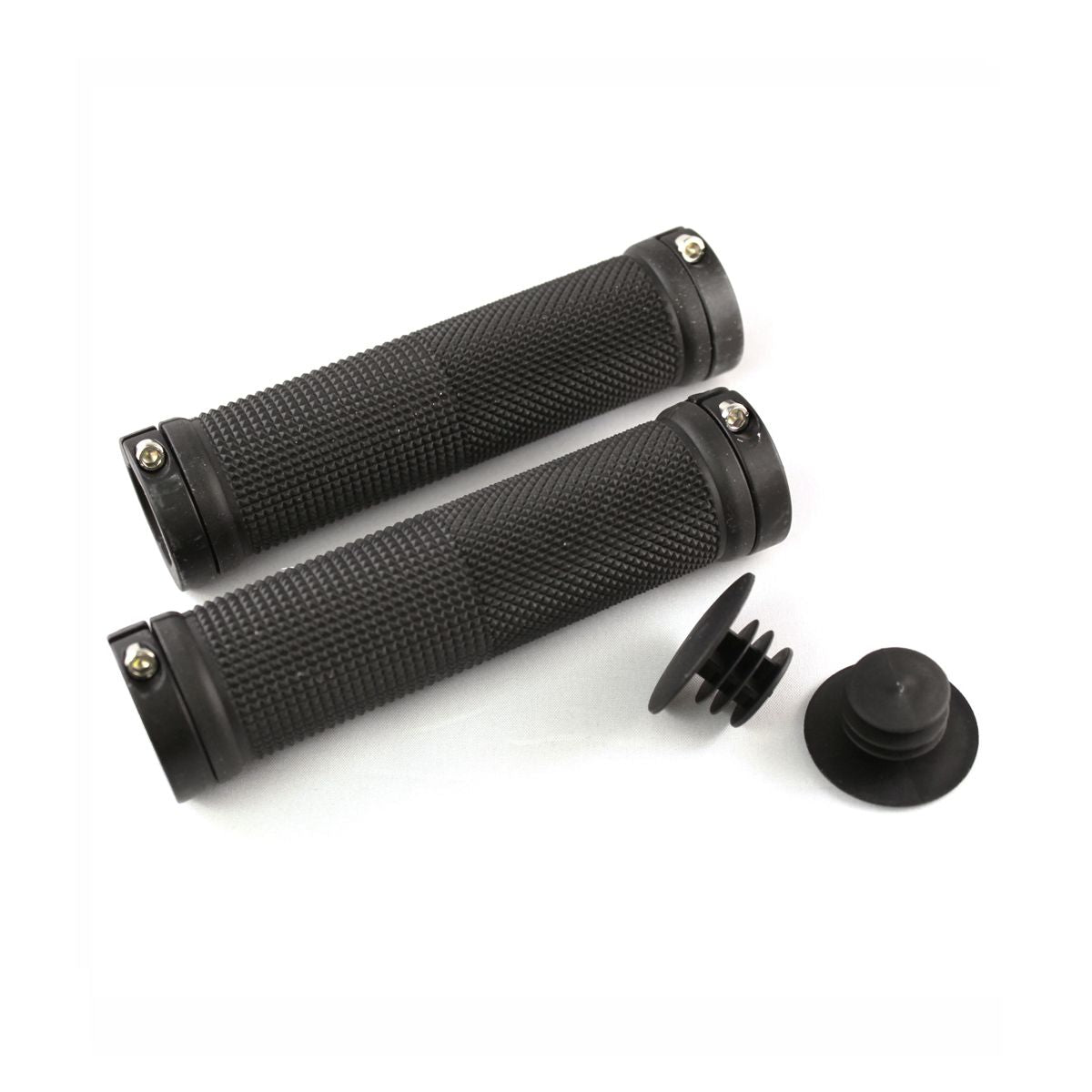 Clarks LOCK-ON grips are constructed with a polypropylene (PP) inner sleeve coated with thermo plastic rubber (TPS) to provide a hard wearing and positive feel. Aluminium locking rings then secure firmly to the handle bar preventing any rotational movement of the grip. Available in a range of grip colours and anodised aluminium ring finishes, complete with a matching end plugs, Clarks Lock-On grips will enhance any MTB or Hybrid bike.