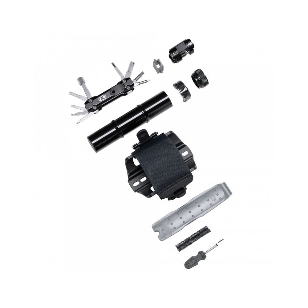 The Tube Stash can be mounted using bottle cage fixings keeping tools on hand for when needed using a hook & loop strap to keep everything neatly stowed. When buying the kit you benefit from the addition of the SOS Multi-Tool and storage for either a hand pump or CO2 cartridge (pump and CO2 not included).