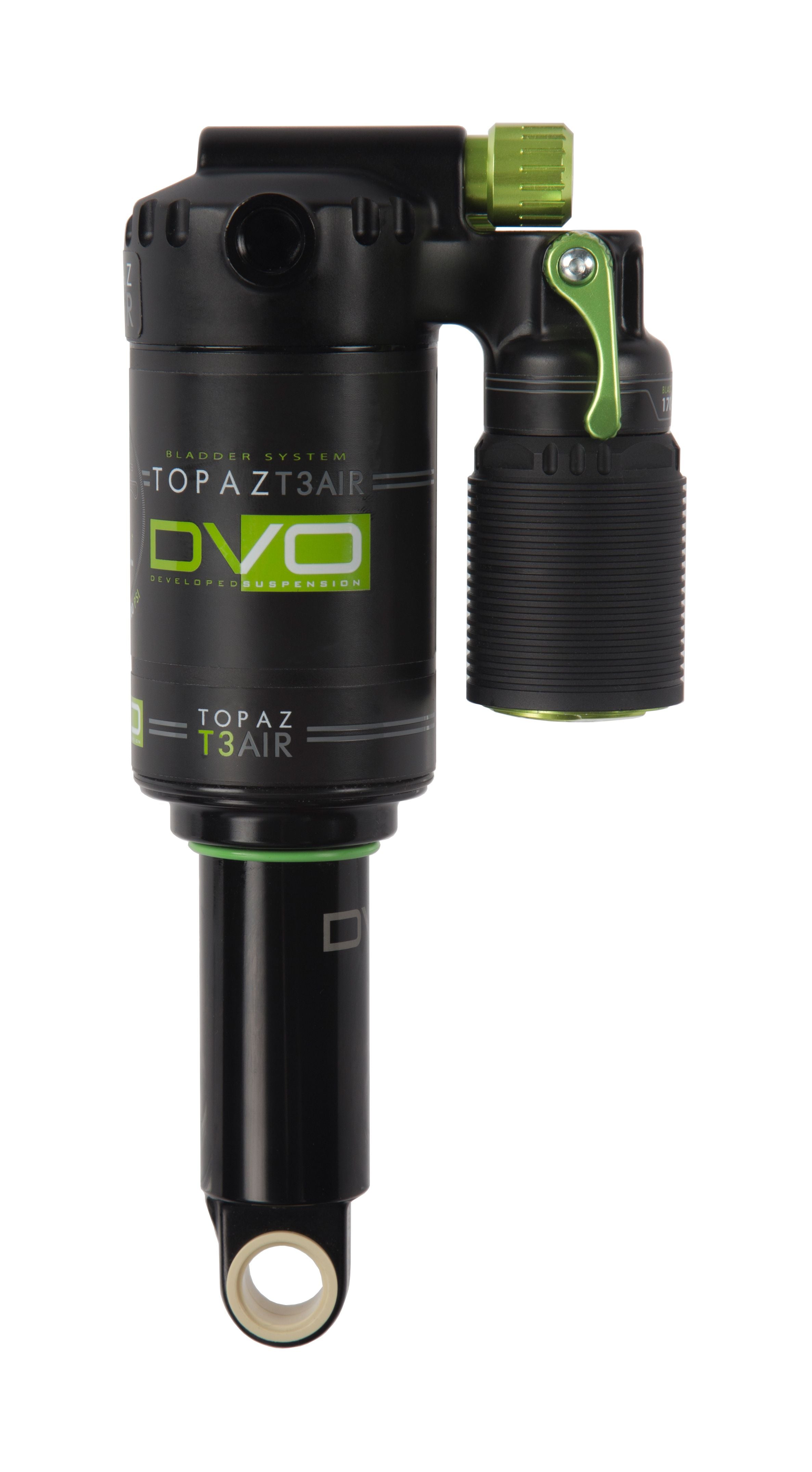 The highly anticipated DVO air shock has landed. We spent two years of development time to craft an air shock that could stand up to the abuse from the best riders in the world. Air volume is easily tunable via air volume spacers that can be removed or installed in a matter of minutes. Unmatched small bump compliance and damping is achieved from the bladder and loader style compression unit. Cooling fins on the reservoir allow heat to effectively dissipate from the shock, keeping temperatures low and damping consistent. The T3 Compression adjust gives you three compression settings for pedalling, traversing and descending.