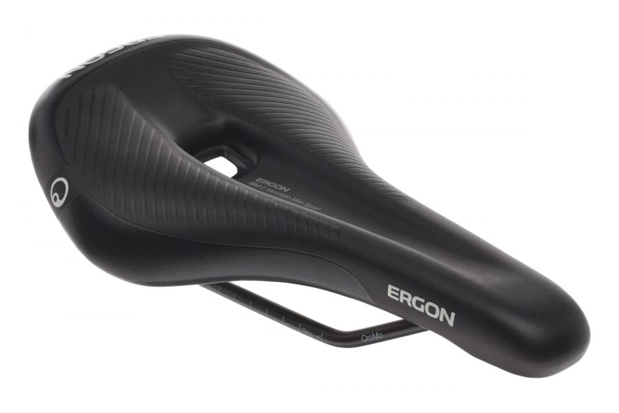 The Ergon design team has analyzed the requirements of E-Mountain bikers in detail. Longer periods of sitting, steeper uphills and greater levels of impact characterise the E-MTB experience. After intense development, the optimal saddle shape was found. The rear ramp better supports the rider in steep uphillriding situations when seated. The V-shape offers freedom of movement across the wide fl anks up to the padded nose €“ important for particularly steep climbs.