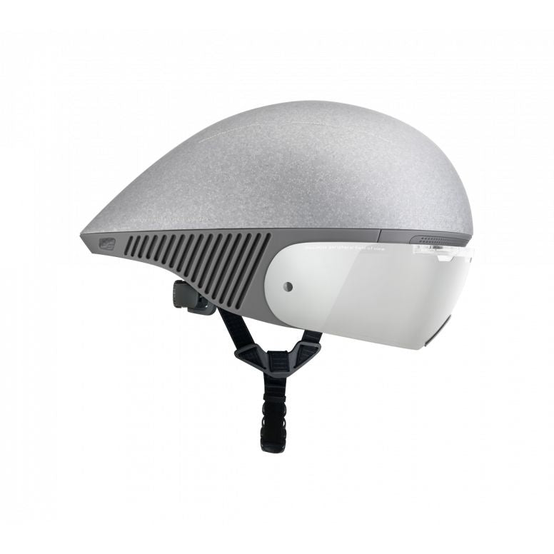Kunee is a performance time-trial and triathlon helmet featuring a smooth surface, teardrop shape, integrated visor, and innovative corrugated side panels—all of which aid in reducing drag for greater aerodynamic performance.
