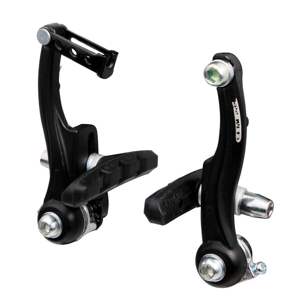 Low profile Mini-V brakes that offer high power braking performance without the need for a specific V-type lever, as is required with conventional long arm V-brakes.