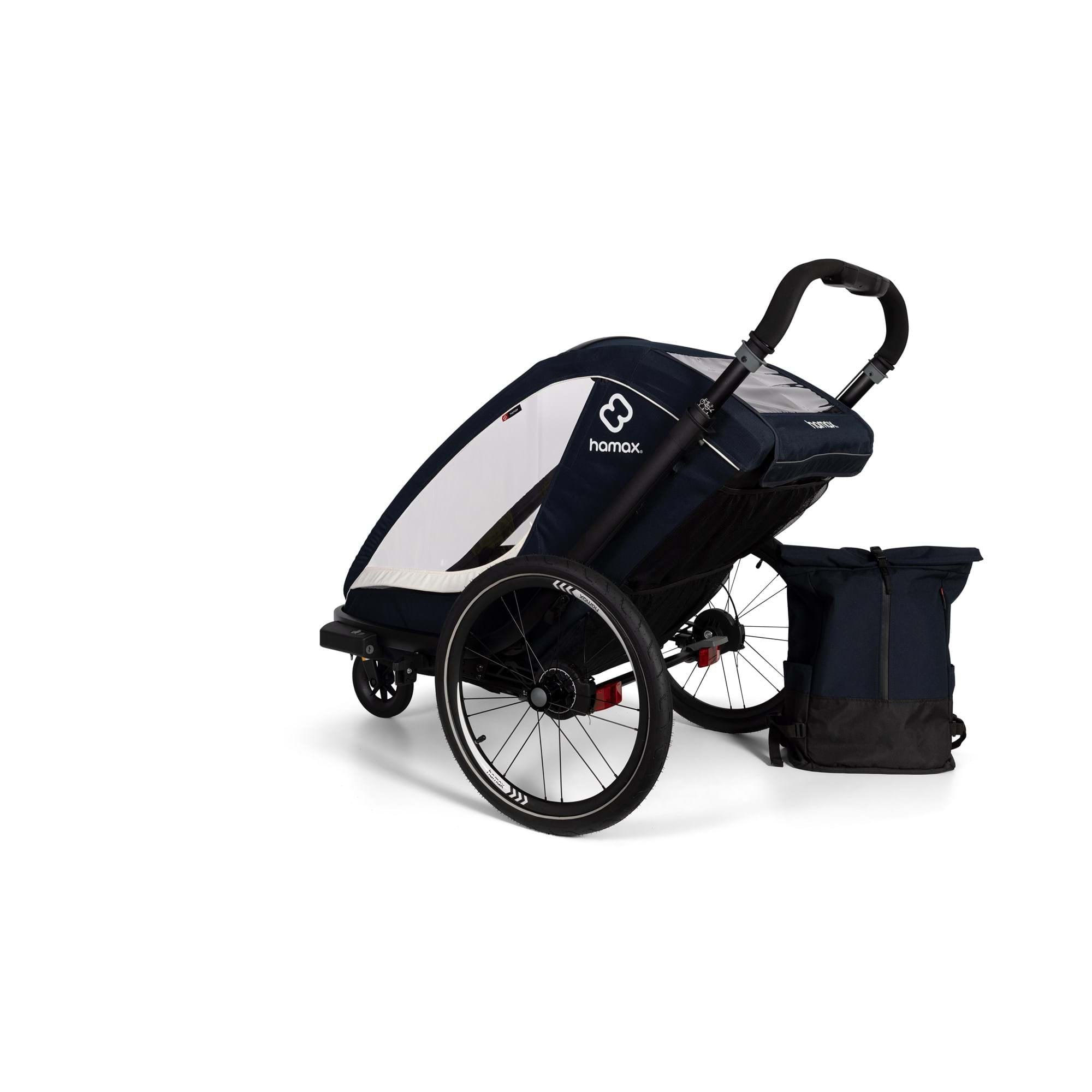 Bags are attached to the rear of the trailer. They are detachable, so that you can bring them into stores, coffee shops or similar - or just keep the extra diaper and other necessities in a confined space. The Breeze bag can be used as a backpack.