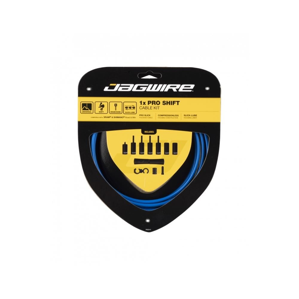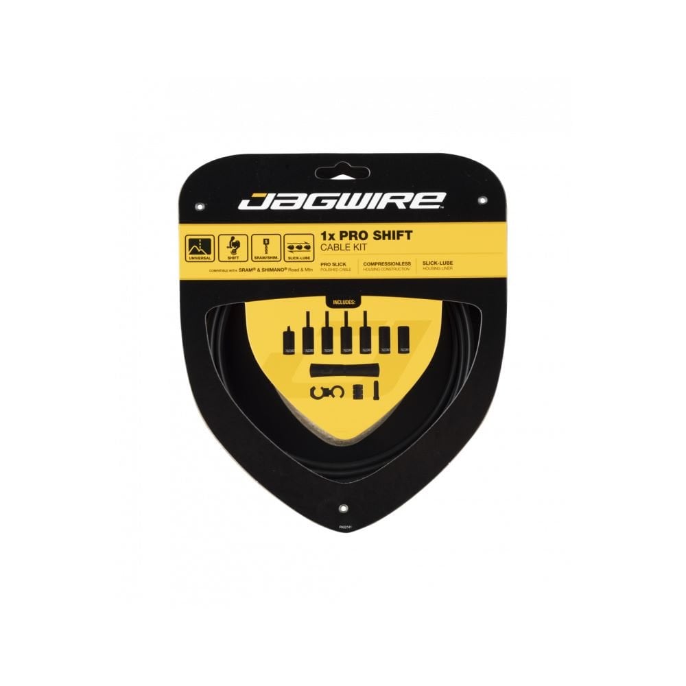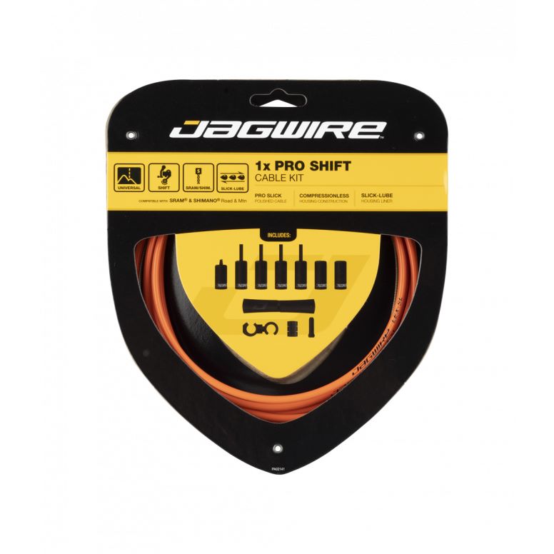 Jagwire Pro Shift kits deliver improved performance and style. Pro polished cables used with improved Slick-Lube liners provide an upgrade over OEM cable systems, with enhanced shifting precision and long-lasting performance. Available in 1x or 2x versions, our Pro Shift kits are designed to work with nearly all frames and shifting systems. And with small parts included for both road and mountain systems, these kits are quick and easy to install. Pro Shift kits are offered in 10 colors to match Jagwire's Pro Brake and Hydraulic Hose kits. Pro Polished Slick cables combined with Slick-Lube liners offer enhanced shifting precision and long-lasting performance. All parts are included for a complete shift cable and housing installation on a road or mountain bike. Kits contain extra-long inner cables and ample housing for large frames or continuous housing runs. 2x kits are designed for use with both front and rear derailleurs, while 1x kits are for rear derailleur or internally geared hub only. Black kits contain gloss black housing with silver logos; Stealth Black kits have matte black housing featuring black logos.
