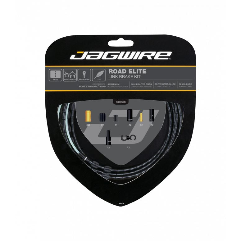 Jagwire Elite Link Brake Kits are the ultimate combination of durability and attention-grabbing looks. Available in six eye- catching colors and for road or mountain bikes, they improve any bike €š „ ´s performance and appearance. The Elite Link housing uses a series of aluminum links to provide a compressionless system for better braking performance with enhanced modulation. But unlike other compressionless housing, its fLEXibility allows for tight bends without kinking. It €š „ ´s also much lighter than traditional housing while being more durable. Combine these benefits with Elite, ultra-slick polished cables and Slick-Lube liners, and you €š „ ´ve got the best of performance and style. Precise, compressionless braking performance combined with extreme fLEXibility. Each kit comes with links pre-installed on housing segments making setup quick and simple. 50% weight savings compared to traditional brake housing. Durable, ultra-slick polished inner cables minimize system friction.