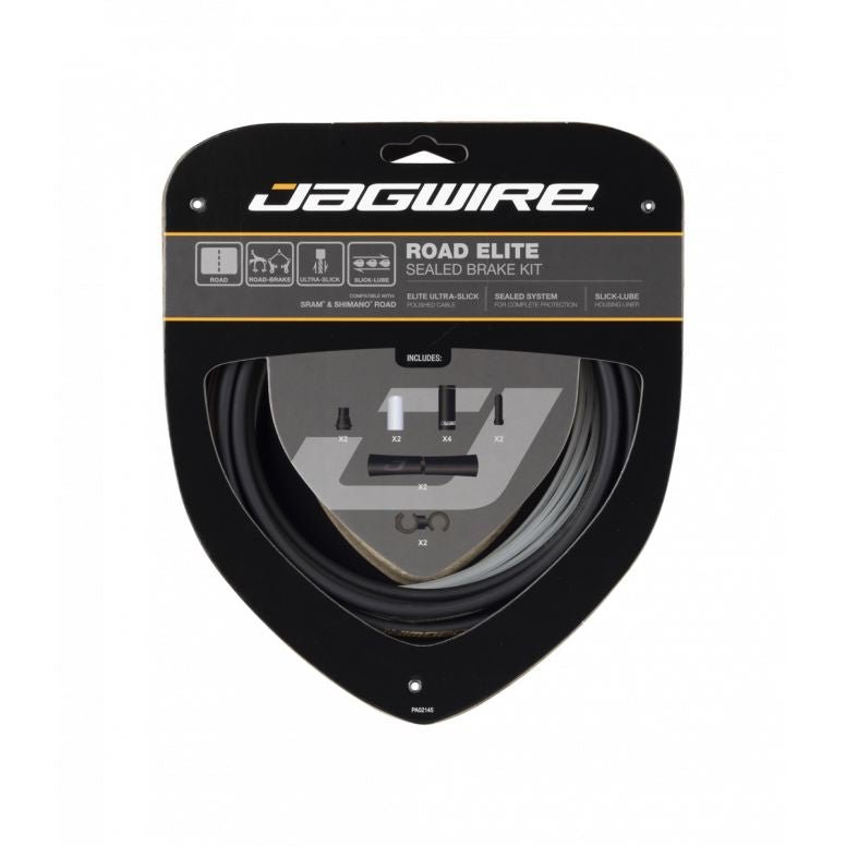 Jagwire Sealed Brake Kits use a continuous liner that seals the system completely, protecting it against dirt, water, and other contamination. Available in three colors for road bike brake systems, this system offers the ultimate combination of protection and low-friction performance. To ensure the best possible performance, we've paired Elite Polished Ultra-Slick inner cables with our Slick-Lube continuously-lubricated liners. This combination delivers precise cable movement and excellent durability. The continuous liner running from the levers to the brake calipers offers outstanding protection from dirt and debris. Elite Polished Ultra-Slick cables are paired with Slick-Lube liners to minimize friction. Since most high-performance mountain bikes use hydraulic or mechanical disc brakes with full housing, Elite Sealed Brake kits are available only for road bikes.