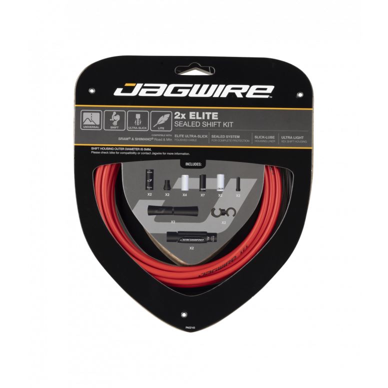 Jagwire Elite Sealed Shift Kits use a continuous liner that seals the system completely, protecting it against dirt, water, and other contamination. Available in three colors and for 1x or 2x drivetrains, this system offers the ultimate combination of protection and low-friction performance. To ensure the best possible performance, we've paired Elite Polished Ultra-Slick inner cables with our Slick-Lube continuously-lubricated liners. This combination delivers precise cable movement and excellent durability. The continuous liner running from the levers to the derailleur offers outstanding protection from dirt and debris. Elite Polished Ultra-Slick cables are paired with Slick-Lube liners to minimize friction. Lightweight XEX shift housing is nearly 30% lighter than traditional shift housing. 2x kits are designed for use with both front and rear derailleurs, while 1x kits are for rear derailleur or internally geared hub only.