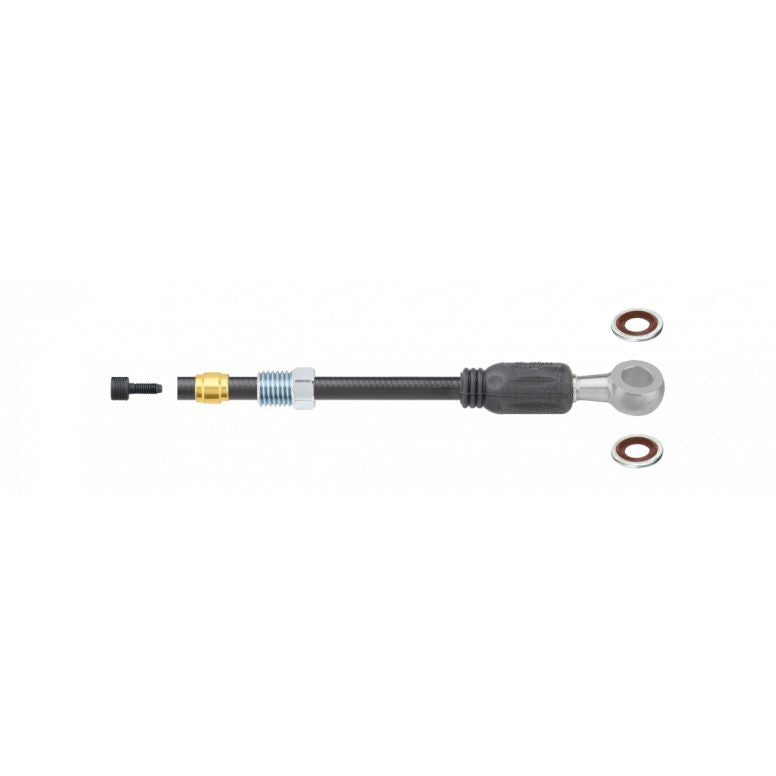 High quality hydraulic control lines don't have to come with a premium price. The new Jagwire Sport Hydraulic Hose kits provide dependable performance and offer exceptional value. An excellent alternative to OEM hydraulic hose, they feature a durable, fLEXible reinforced layer surrounding a low-friction inner tubing to deliver light brake lever action and trustworthy braking power. Offered as single hose kits for individual brakes or in bulk boxes for workshop use, Sport Hydraulic Hose is available for most popular road and mountain hydraulic disc brake systems. High performance hydraulic hose provides effective braking power and control. Available separately for DOT or mineral oil hydraulic disc brake systems. Kits include hose and fittings for a single brake; no additional fittings are required. Bulk boxes include 10x 2000mm hoses with caliper-side fittings pre-installed or 30 meters of uncut hose (mineral oil only).