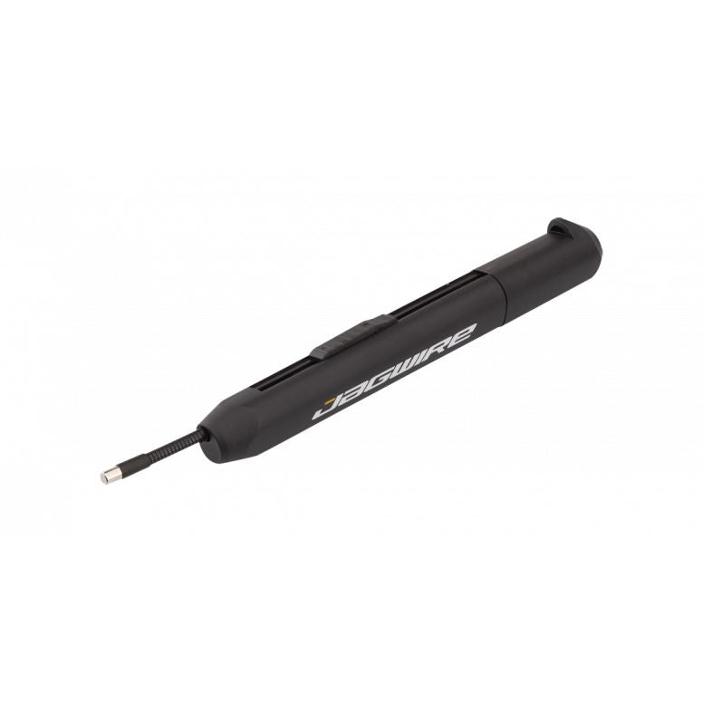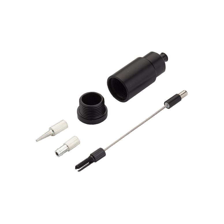 Jagwire's Pro Internal Routing Tool simplifies routing through a frame, using powerful magnets to safely and easily guide inner cables, housing, hydraulic hose, and e-shift wires. A retractable, fLEXible magnet can be inserted into the receiving end of an internal cable run to find the magnetic adapter and easily pull it through. Adapters for inner cables, hydraulic hose, and Di2 e-Tube wires are included. The adapters nest neatly inside tool body when not in use.