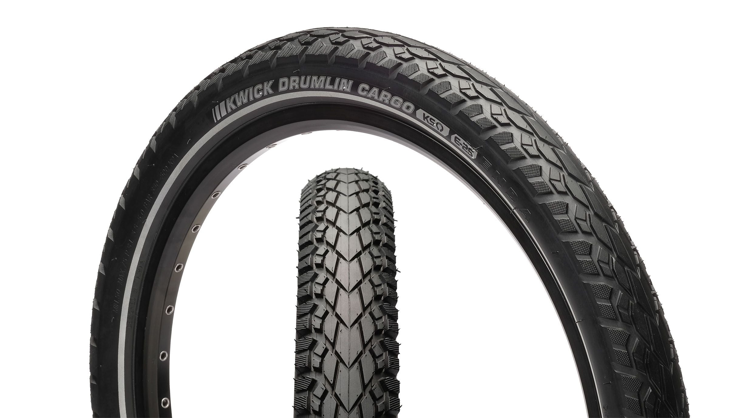 The Kwick Drumlin Cargo was specifically developed for cargo e-bikes. A special 4-ply construction and sub-tread puncture breaker result in a load capacity of 150 kg per tire and an increase to overall durability.