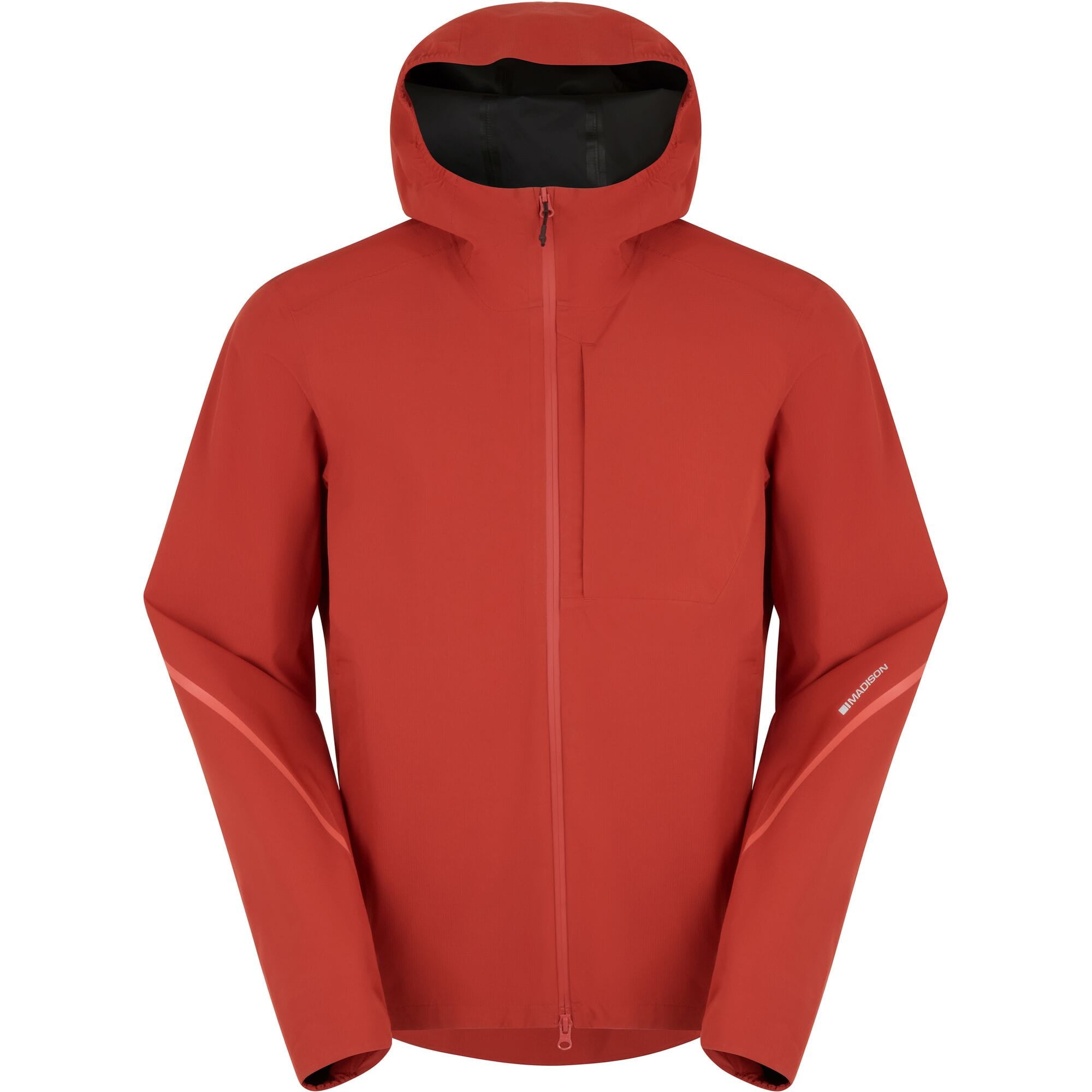 Waterproof gravel and trail cycling jacket with hood, built to keep you dry in changeable weather. Packable with a relaxed fit, features three zip pockets and elasticated hem and cuffs
