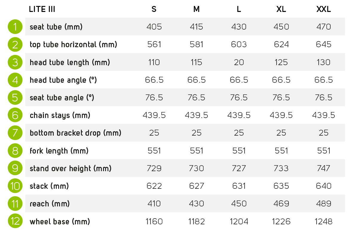 | Frameset | Lite III - Hydroformed 6061 double butted aluminium with intergrated battery. Internal cable routing via Smart entry ports. Tapered head tube, 148 x 12mm axle standard. Max. tyre size 27.5" x 2.8". |