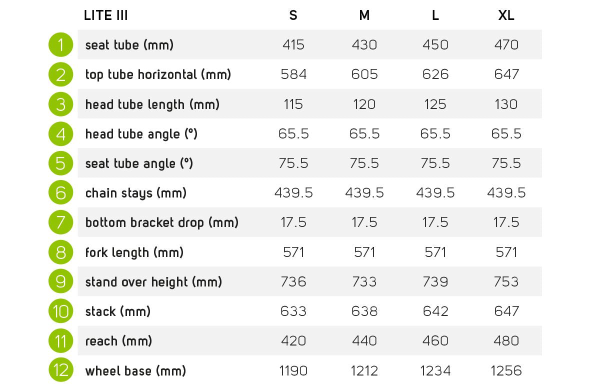 | Frameset | Lite III - Hydroformed 6061 Double butted aluminium with intergrated battery. Internal cable routing via Smart entry ports. Tapered head tube, 148 x 12mm axle standard. Max. tyre size 27.5 |