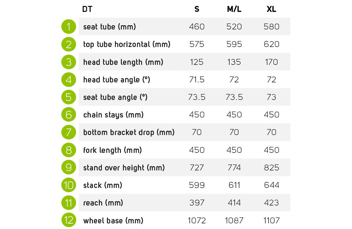 | Frameset | DT - 6061 double butted technoformed aluminium. BSA BB standard, 135 x 9mm QR axle standard. Mounting points for rack, mudguards and kickstand. Max. tyre size 700 x 42c |