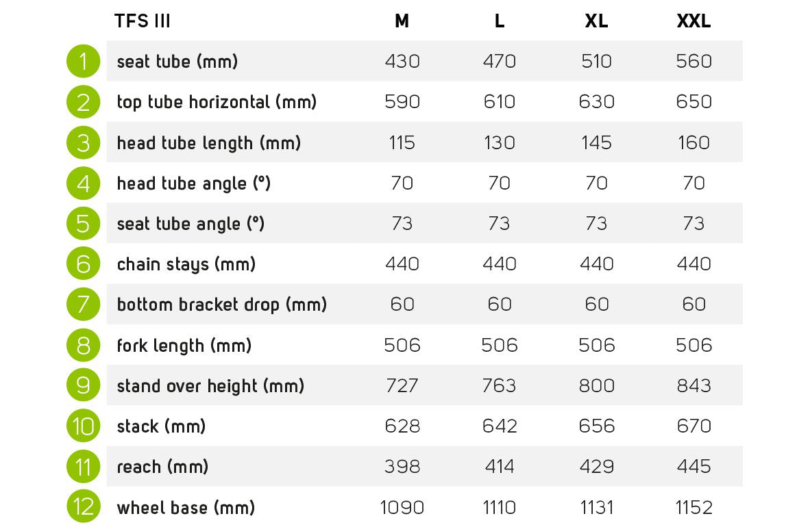 | Frameset | TFS III - 6061 aluminium, double butted and technoformed. Tapered head tube. Chain stay mounted disc brake. Internal cable routing. Mudguard and kick stand mounts. BSA threaded BB. 135mm x 9mm axle. Max. tyre size 29" x 2.25" |