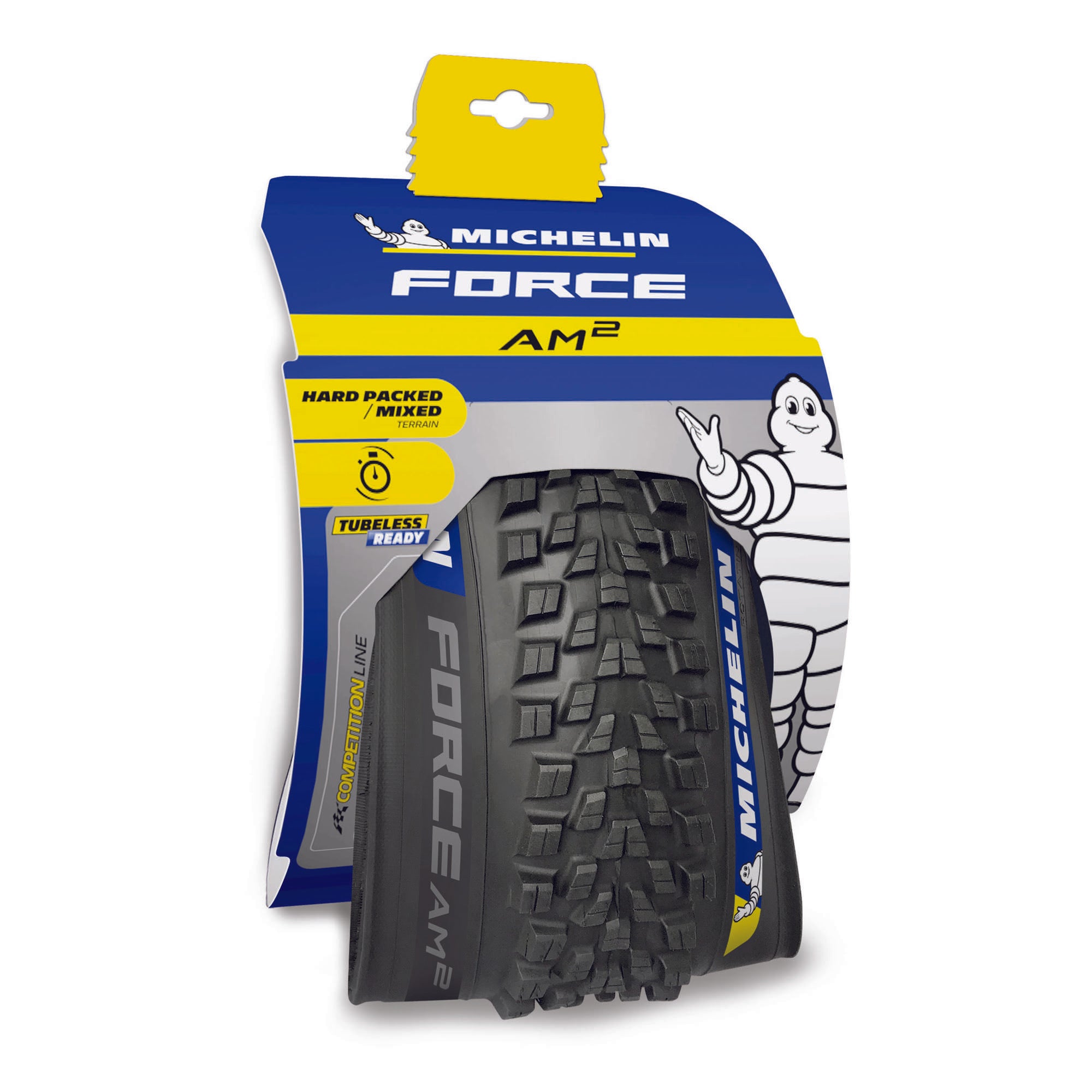 The MICHELIN FORCE AM ² is designed as a fast-rolling tyre optimised for mixed terrain, hard-pack or trail centre conditions. It has a directional tread pattern designed for excellent rolling efficiency, but which also offers high grip levels under braking and in corners. The tread features elongated centre blocks for reduced rolling resistance and less ground penetration, but with prominent block edges for braking grip and traction. The shoulder blocks are inspired by the MICHELIN DH22 tyre and these ensure grip and stability in corners, along with progressive and predictable handling characteristics. In addition, an optimized ratio between tread blocks and grooves helps maintain momentum on flowing trails.