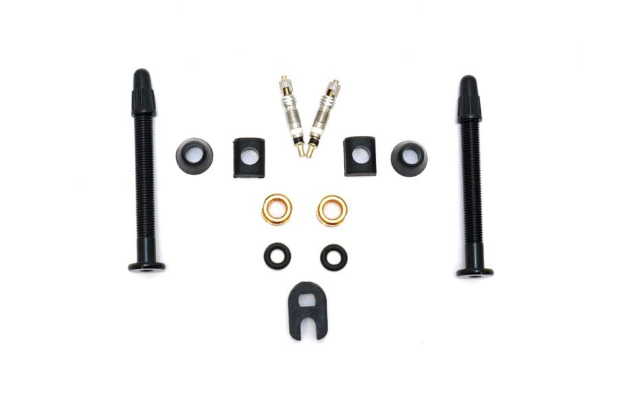 Valve stems with a large, sturdy base plate that can be fitted with different shaped rubber grommets for an airtight universal fit to any shape and depth of rim.