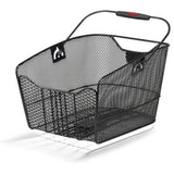Longitudinal fine-mesh basket with handle and extra large volume. While riding you can clamp the handle between the horizontal rails in the back to avoid rattling.