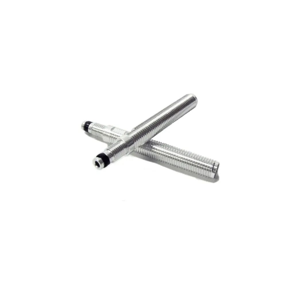 A pair of 40mm effective length threaded valve extensions for use with removable valve core presta valves. Allows deep section rims to be converted to tubeless use by way of external threads for securing the presta nut. The only externally threaded valve extenders on the market.