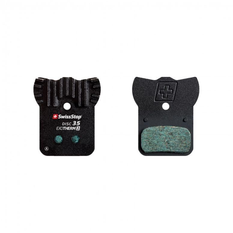 SwissStop EXOtherm 2 pads combine an extremely durable, smooth modulating pad compound with a cooling fin equipped back plate which provides consistent, powerful braking in all conditions.
