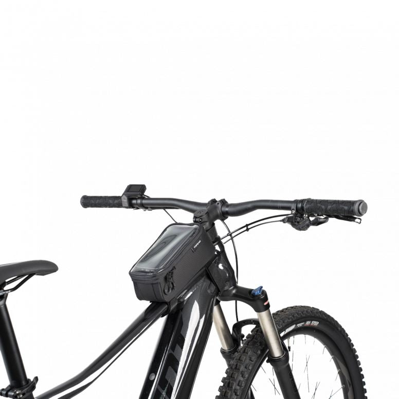 A top tube bag and phone case 2-in-1 design, featuring a transparent protective film that allows you to operate your phone while it's inside the bag. The second compartment of the bag features dividers that allow you to easily organize and store small items such as credit cards, loose change, keys, and other personal belongings.