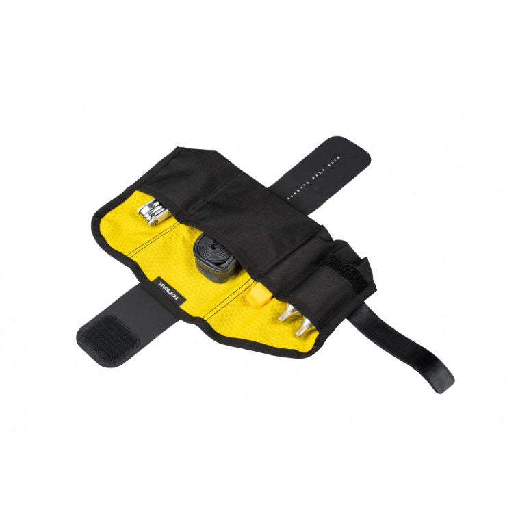 A compact and lightweight roll bag designed specifically for road, gravel and mountain bikes. It features four compartments for storing inner tubes and essential tools. The durable water repellent and stain resistant coating keeps contents dry and cleans up easily. Secure strap provides tool-free mounting to frame tube, seat post or to saddle rails.