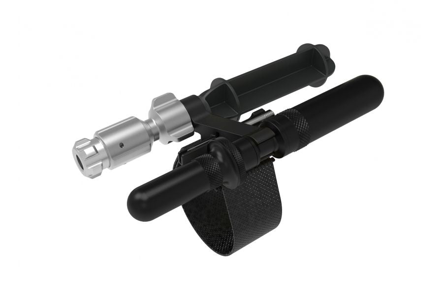 A complete tubeless tyre repair / CO2 inflation kit. Contents consist of tubeless repair tools with four tyre plugs stored inside a machined pod, and a MicroAirBooster CO2 inflator head secured to a mounting module that can be strapped to a frame tube or seatpost.