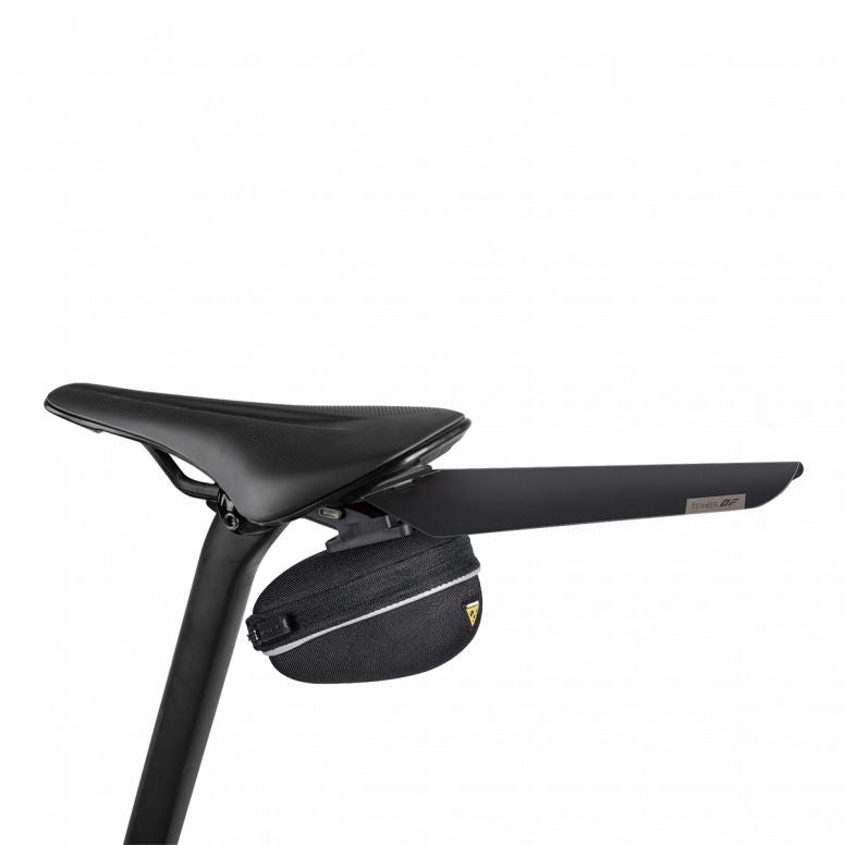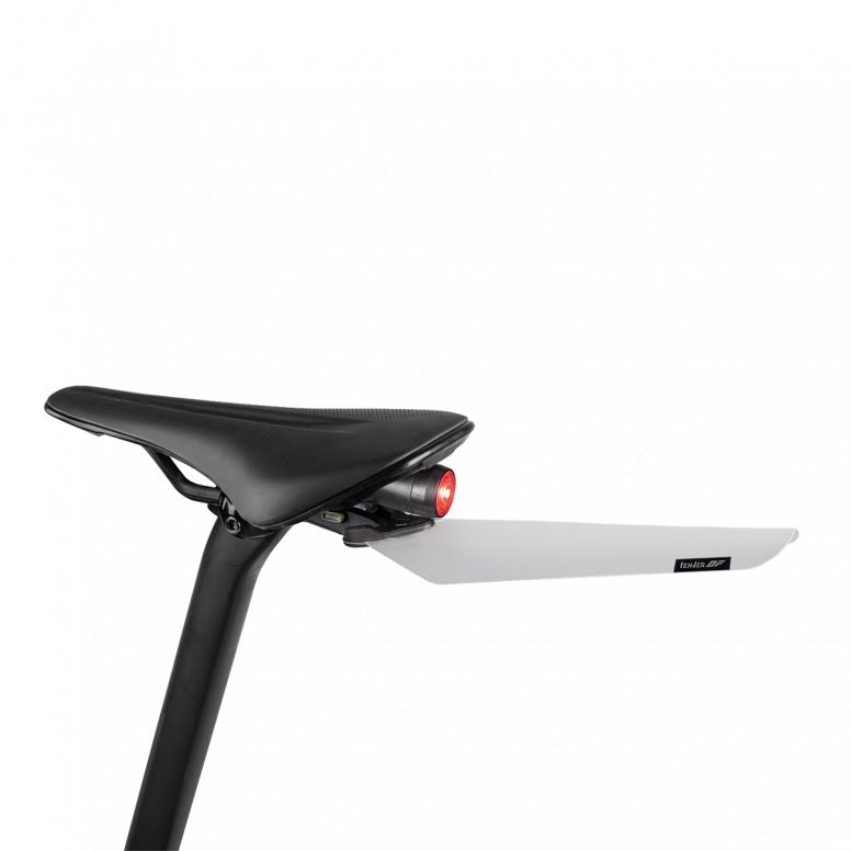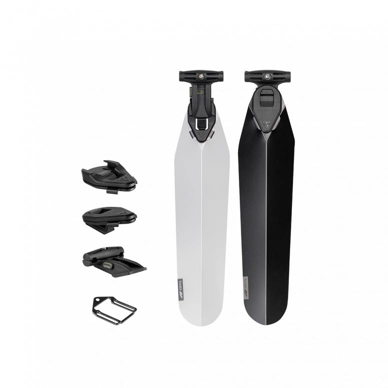 Durable polypropylene fender is ultralight, stylish, and simple to slide and click then ready to go when wet weather arrives. Included Duo Fixer allows fast and easy tool-free mounting and removal and provides dual use with Topeak Duo Fixer system accessories, including Topeak QuickClick saddle bags or most strap type saddle bags, Tubi tools, CO2 inflators, and lights underneath the saddle. Black and transparent colors with exchangeable upper and lower backets as a set for the color options and mounting position option to suit different needs.