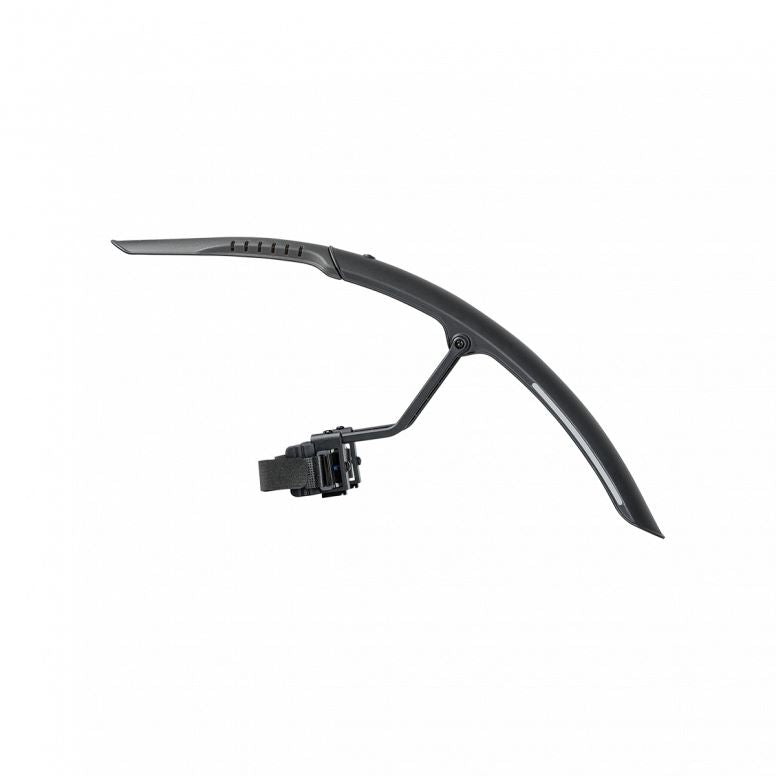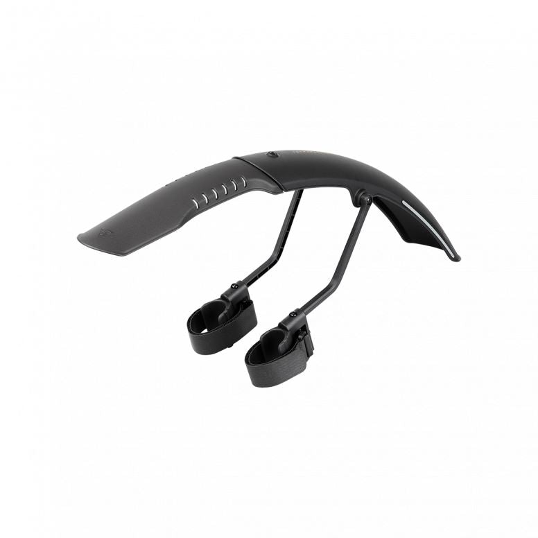 The perfect quick-mount, dual color fenders that attach to gravel bikes with hook and loop straps easily and securely. Adjustable struts provide a closer fit to the tyre and excellent mud / spray protection while the highly polished underside helps prevent dirt buildup and aids in cleaning. For the rear, a unique two-piece, dual tone design provides short or longer fender usage options for a precise fit with your bike. Included 3M reflective decals provide safety at night.