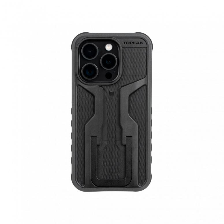 The RideCase for iPhone has a scratch-resistant, dual-density, non-slip, high-grade engineering polymer/rubber exoskeleton for shock and impact protection that holds your phone securely while on the go. Its full angle adjustment allows viewing in portrait or landscape modes and an Integrated flip stand for post-ride hands-free viewing. Compatible with Type-C charging.