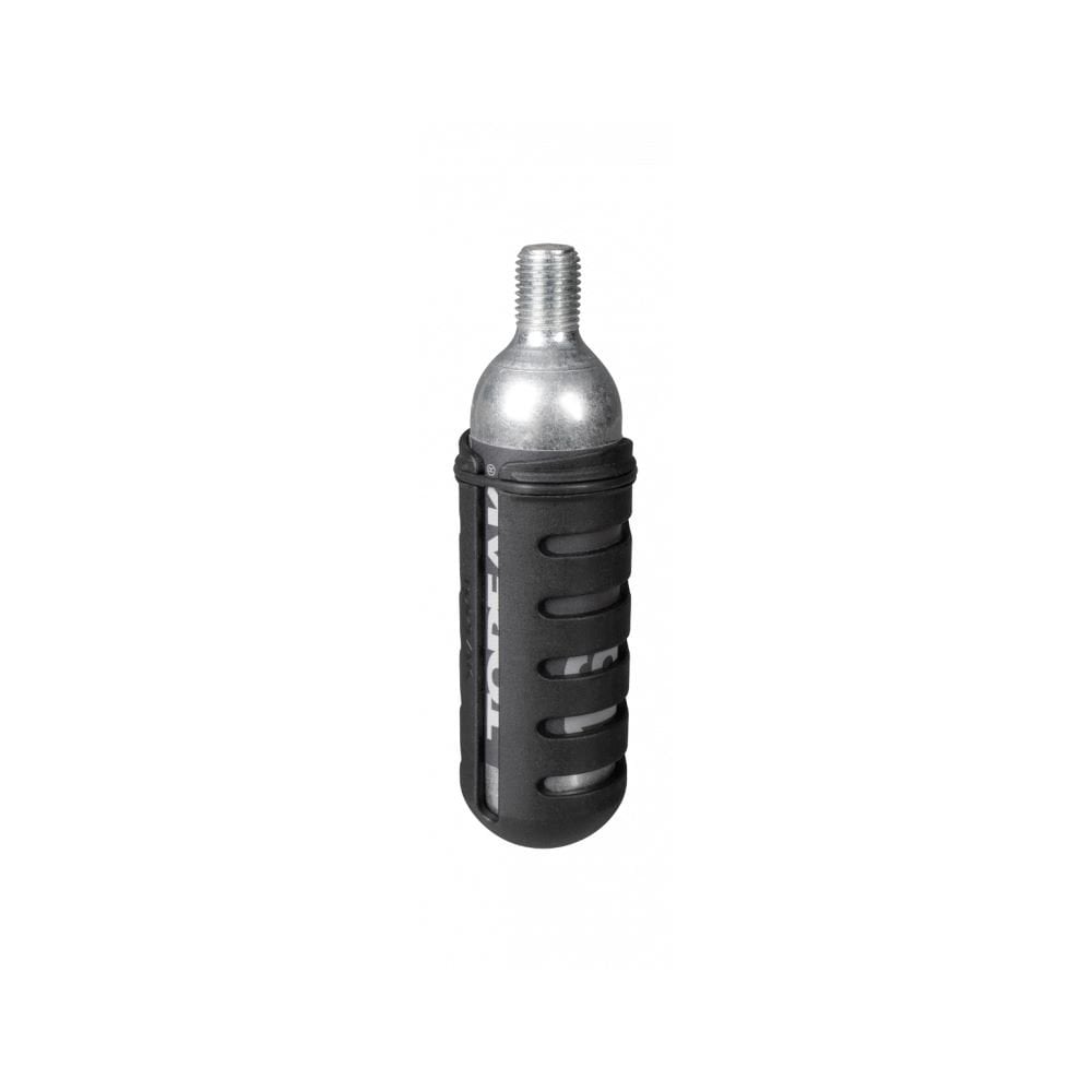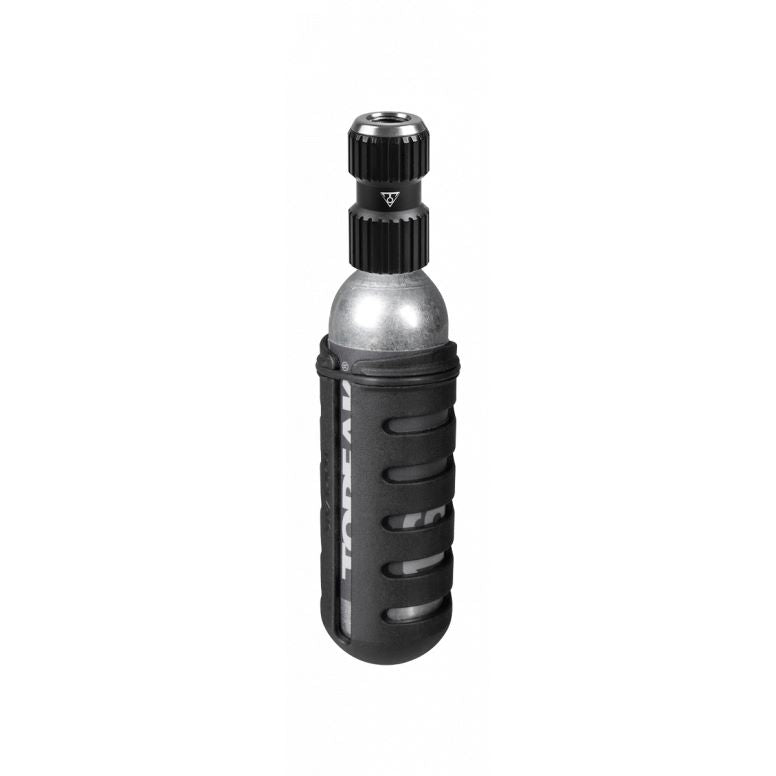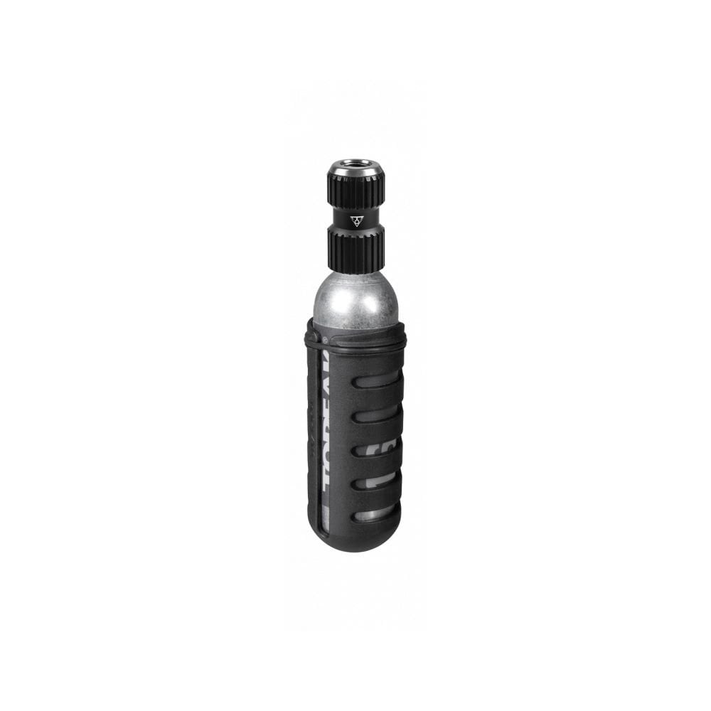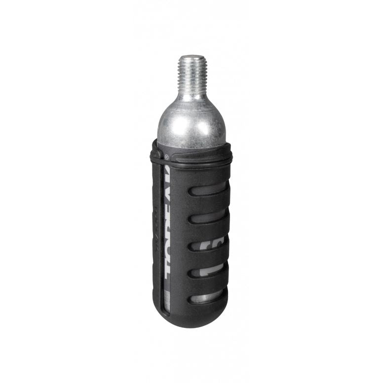 An extremely compact, lightweight and easy-to-use CO2 inflator. Precision CNC machined aluminum inflator fits Presta and Schrader valves and works with threaded 16g or 25g cartridges. Simply screw the cartridge in tight and then screw the head onto the valve, unscrew the cartridge to release all the gas from the CO2 cartridge in seconds. Included CO2 Cartridge Shell protects your hands from cold cartridges during inflation.