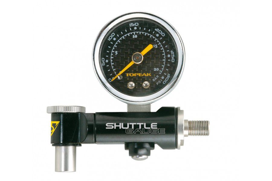 TOPEAK SHUTTLE GAUGE Versatile mini gauge which attaches to your pump or can be used alone. Gauge face rotates 360° and reads to 300psi for use with tyres, forks or shocks. Includes precision bleeder valve and Pressure-Rite connector. Presta and Schrader connector Anti-air loss shock valve Pressure release button Rotating 300psi gauge 7.6x8.2x2.5cm Available with or without bag 120g