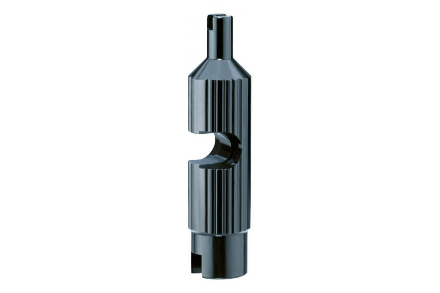 A metal valve tool designed to tighten or remove Schrader and two-piece Presta valve cores. Can also be used to tighten or loosen Presta valve extensions.