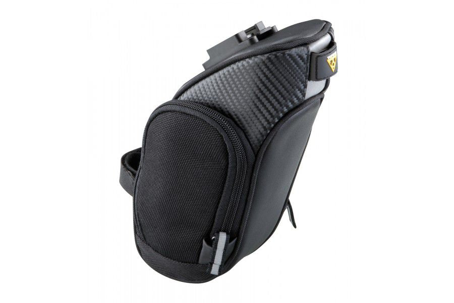 The smallest in the range is seat positions. Two side opening moulded panels provide easy access to all your gear and feature inner mesh pockets to keep keys and for suspension bikes, folding bikes, endurance racers, day touring or for cyclists who like to carry extra gear. Dual access main compartment Internal mesh pockets QuickClick ™ mounting system 3M ™ Reflective Strip 1200 Denier Polyester Tail light strap 24x11x12cm Capacity: 1.2 Litre/75ci 200 g