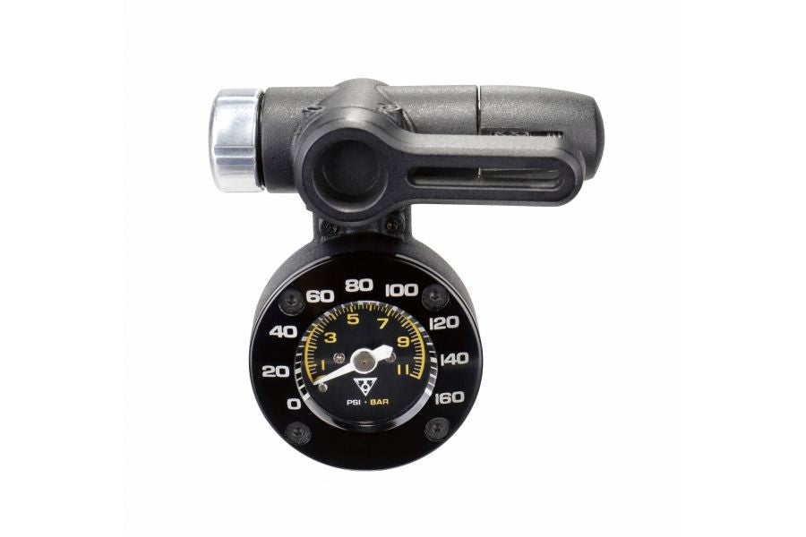 This mini sized gauge can be attached between the pump and valve to read pressures while pumping or used alone. Provides pressure readings up to 160 psi / 11 bar. Rotating gauge is easy to read and the head works with Presta, Schrader or Dunlop* valves on bikes / motorcycles / car tyres, forks or shocks while the Thumb Lock lever ensures an airtight seal. An air release button allows fine tuning of pressure.