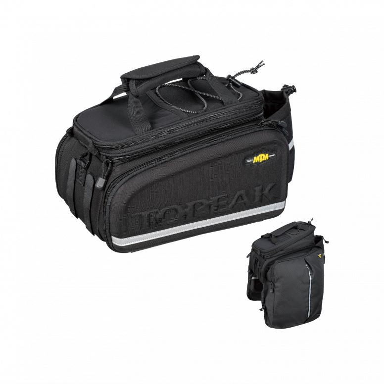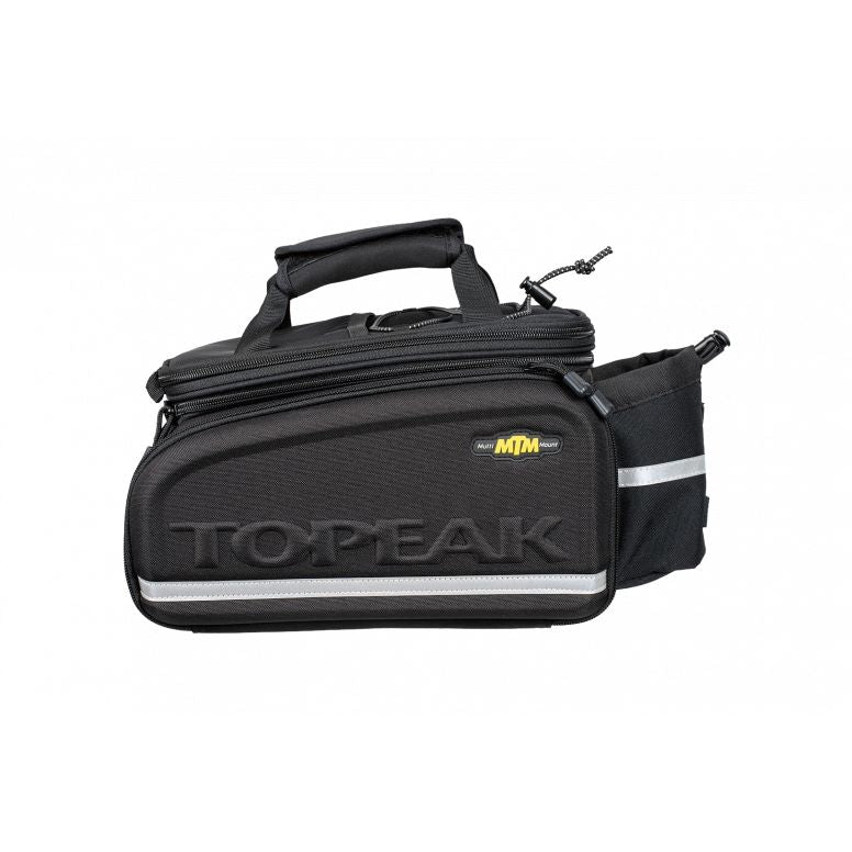 Dual molded side panels combine with flexible 600 denier fabric to form a semi-rigid, weather resistant trunkbag. Divided main compartment and side panels expand for extra storage capacity. Rear water bottle holder lets you carry more water on extended trips. Attaches to a rack with straps, or use the integrated plate to quickly and easily install a KLICKfix ® / Racktime ® Snapit or MIK ® Adapter.