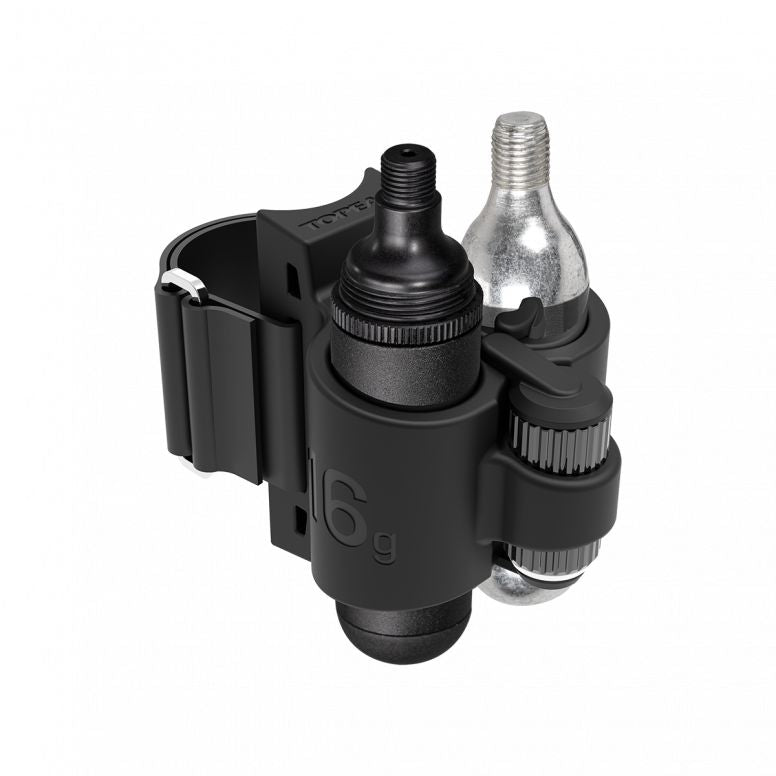 inflation kit features Nano AirBooster CO2 inflator, TubiCartridge R16 and one 16g CO2 cartridge for road bikes. Included mounting module with grip strap allows the TubiMaster RX to be attached to seatpost or bike frames with ease.