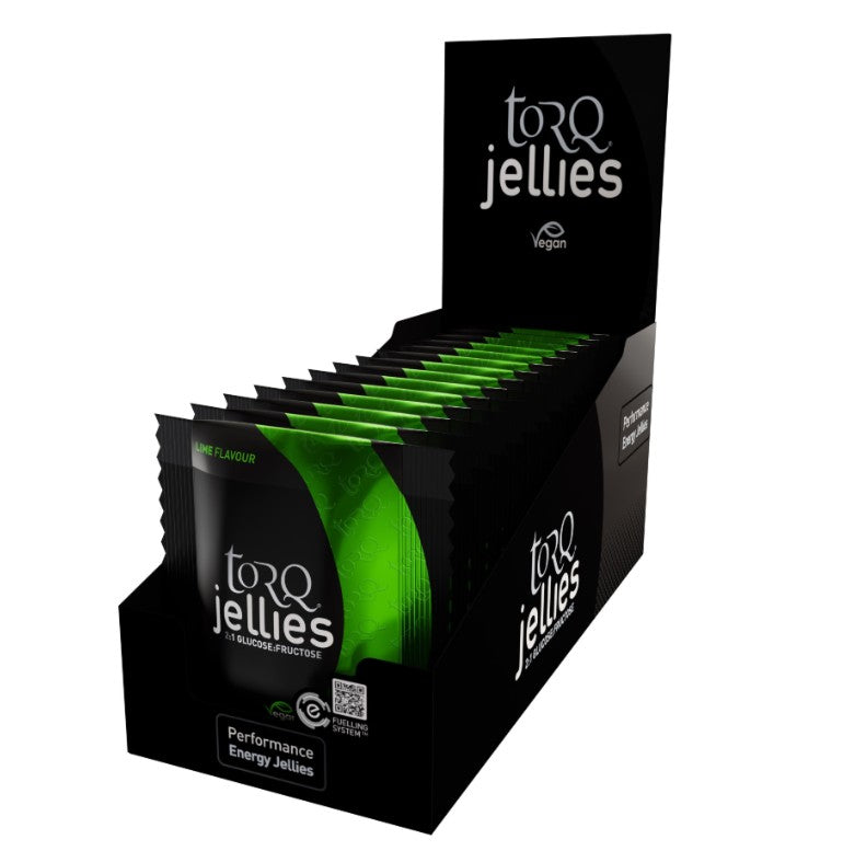 The new addition to the TORQ Fuelling System is here! TORQ Jellies are 6 x energy-rich soft chews, providing a total of 30g of 2:1glucose:fructose carbohydrate. A delicious & convenient way to fuel your ride or run, in 3 amazing flavours – Orange, Lime, Berries - and no colours, artificial sweeteners or preservatives.