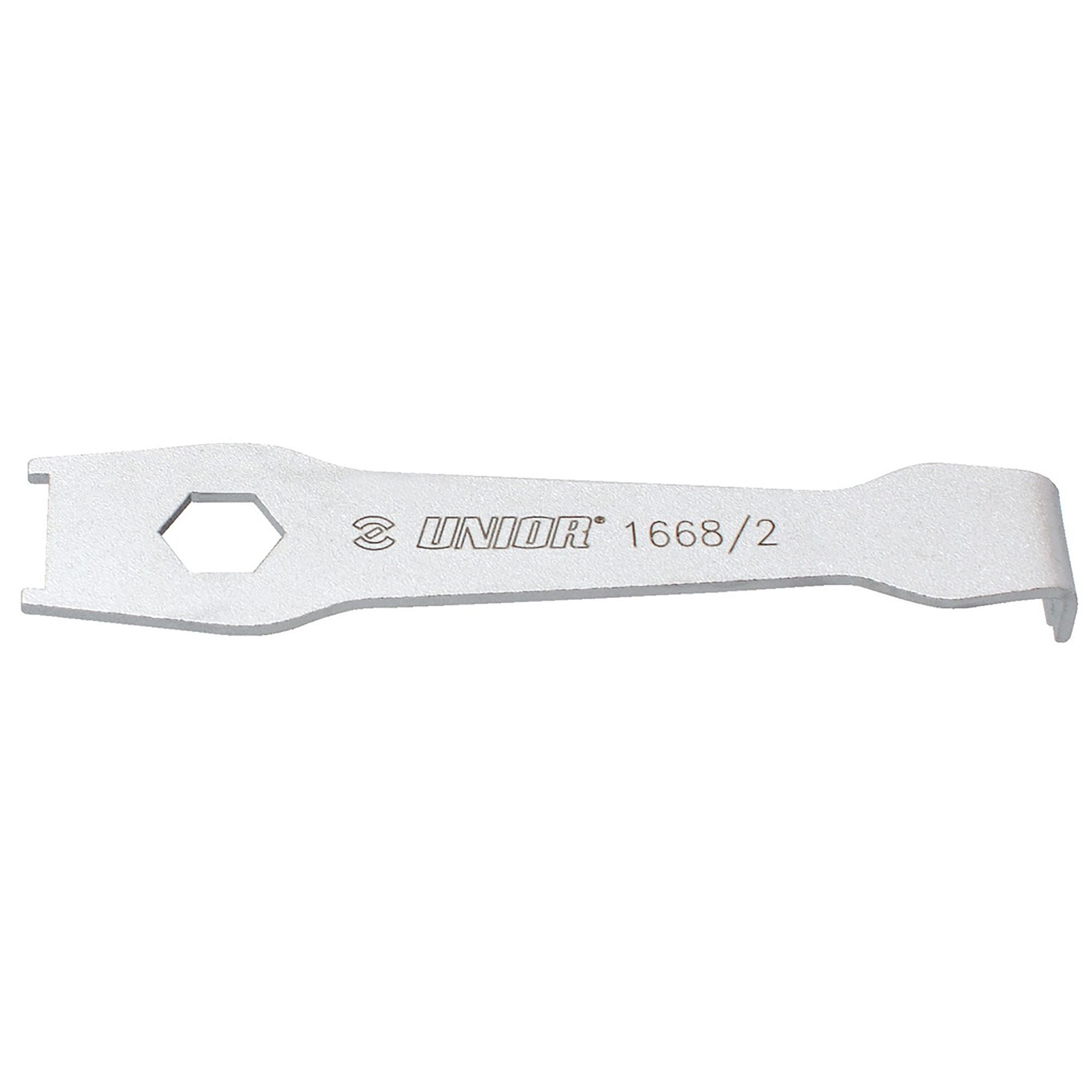 The wrench is used for unscrewing and tightening of front chain ring nuts. The tightening starts with the broader part, and when the nut is sufficiently tightened, it finishes with the narrower part which is bent in order to enable more secure power transfer during the final tightening of the nut. When unscrewing the nut, the key is used in the reverse order.