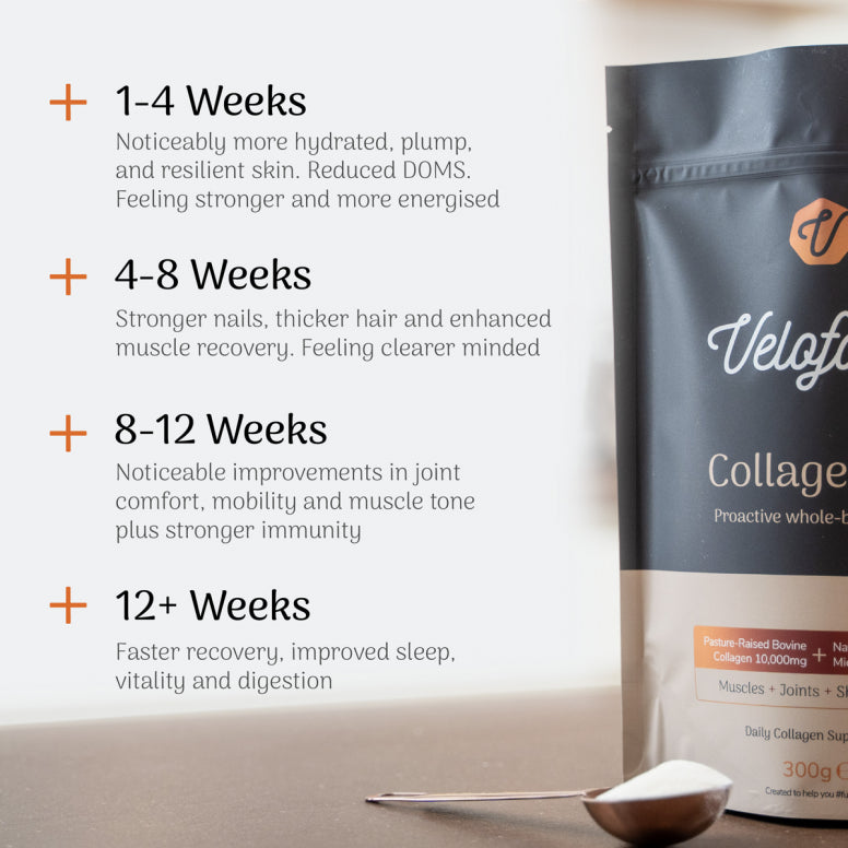 High in Protein and Vitamin C and an excellent source of Vitamin D and Zinc, Veloforte’s CollagenPro blend works as hard as you do – proactively maintaining strong muscles and joints,â´ cognition and immune function, healthy skin, hair and nails. ²