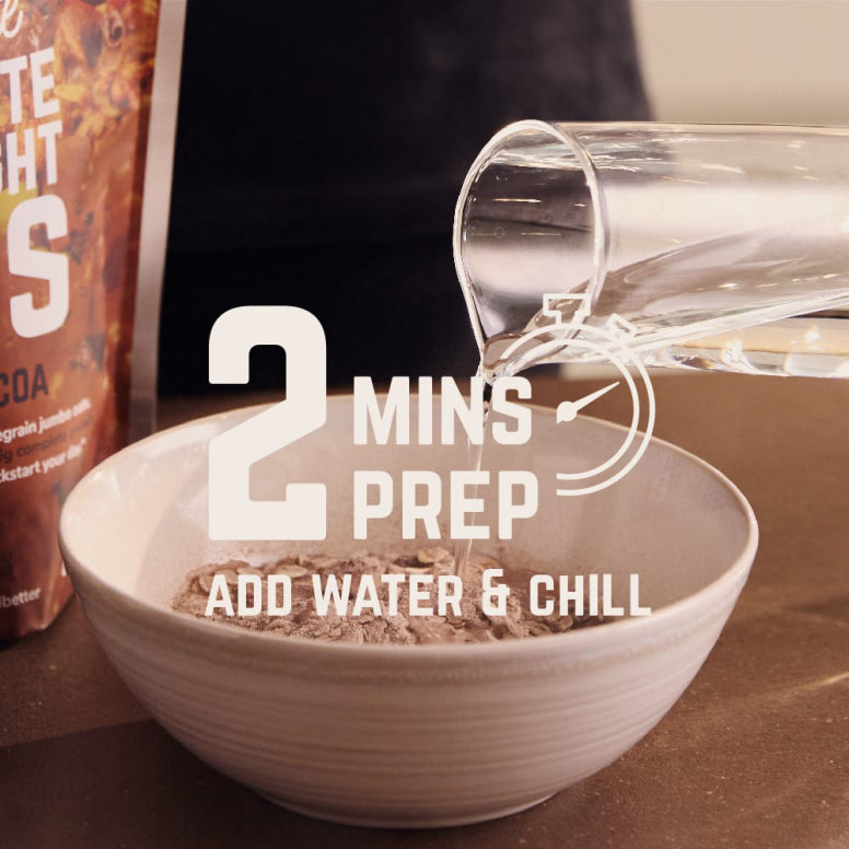 Give the pouch a really good shake, grab a bowl and mix 2/3rds of a Cup (86g) with 125ml water or your favourite milk drink, stir well. Cover and refrigerate overnight (or for at least 4 hours). Once it’s juicy and plump, stir again and enjoy!