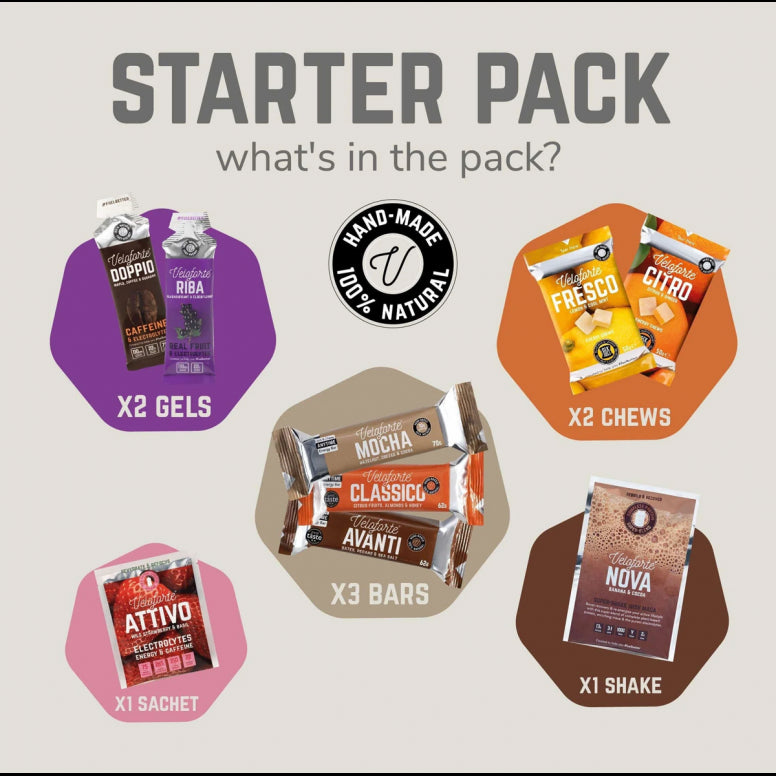 2 energy bars, 1 protein bar, 2 natural gels, 2 soft chews, a refreshingly light real-hydration mix and a Recovery Protein Super-shake with 2g BCAA's.